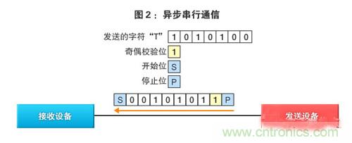 在异步通信模式的串行通信状态下,一字节的文字信息※1在“开始位”(Start bit,意味着开始发送)和“停止位”(Stop bit,意味着停止发送)之间发送(图2)。由此,无需I2C (Inter-Integrated Circuit,内部集成电路)”及“SPI(Serial Peripheral Interface,串行外设接口)”等时钟信号线(但在其他的串行通信模式中这些时钟信号线是必需的,以对发送和接收的时序进行同步)。另外,还可追加用于检查数据是否已正常发送的“奇偶校验位(Parity bit)※2”。