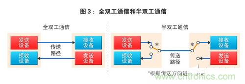 在异步通信中,能实现按“单片机→外围设备”或“外围设备→单片机”的方向确保数据信号专用的信号线时,被称为全双工通信。另一方面,将通过1根信号线来切换通信方向的方式称为半双工通信。全双工方式时需要2根信号线,可同时进行发送和接收。半双工方式时仅需1根信号线,但必须在发送和接收之间进行切换(图3)。