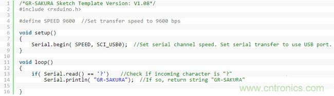 图4:样本程序:从Terminal输入“?”后,将传送回“GR-SAKURA”的信息。