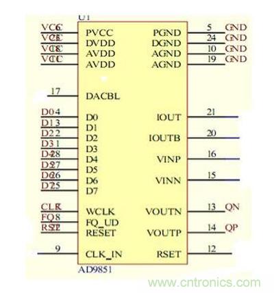 DDS单片频率合成器AD9851的ROM中已预先存入正弦函数表,其幅度按二进制分辨率量化,其相位一个周期360o按2∏/232的分辨率设立相位取样点。然后存入ROM相应地址中。工作时,用单片机送入频率码。输入采用并行方式,8位一个字节,分5次输入,其中32位是频率码,另8位中的5位是初始相伴控制码,3位是掉电控制码。改变读取ROM的数目,即可改变输出频率。