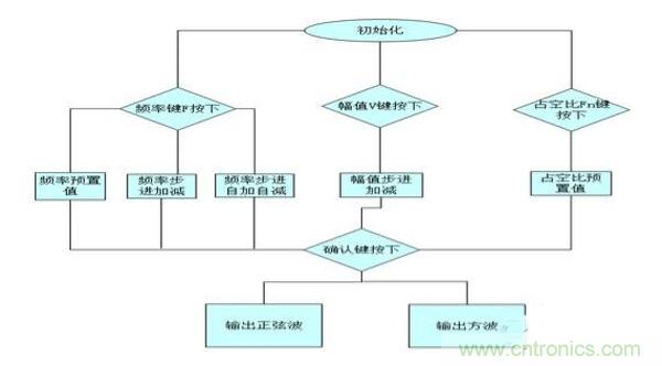 单片机控制AD9851产生频率和相位都可控的正弦波,频率量由键盘设定,步进量为5Hz,AD9851频率分辨率为0.006985Hz,完全能够满足要求。正弦信号送入DAC8831的基准输入端,单片机控制DA的数字量调节其幅值,设置按键调整幅值可实现100mv的步进。在单片机的控制下编程在FPGA内部产生占空比可调的脉冲波,单片机向FPGA送入占空比值和频率值,FPGA通过计数值从而改变输出脉冲波的占空比和频率,设置按键调整占空比和幅值。正弦信号送入DAC8831的基准输入端,单片机控制DA的数字量调节其幅值,设置按键调整幅值可实现100mv的步进。