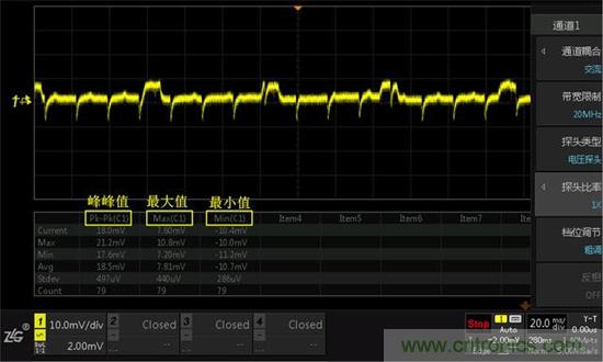 纹波测试一般以峰峰值来表示,具体可以使用【measure】进行自动测量,如下截图ZDS2000系列示波器,能支持51种真正意义的参数测量统计功能,基于全存储深度的基础上测量纹波的参数,或者也可以使用“一键光标”进行手动测量,如下图6所示。