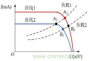 最大功率点A1→最大功率点B1(条件:将系统负载特性由负载1改为负载2)