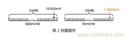 一般数字示波器采用的都是8位ADC,对任何一个波形值都是用256个0和1来重组。假设示波器垂直方向满量程为8格,对应量化级数256。在垂直档位为500mV/div的情况下,垂直精度为(500mV*8)/256=15.625 mV。测量同一个信号,在垂直档位为50mV/div的情况下,即(50mV*8)/256=1.5625 mV,垂直精度就达到了1.5625 mV。