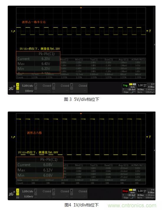 当波形占屏幕6格时,所测的峰峰值为6.08V,相差2个分辨率,相对6V的峰峰值误差为1.3%。