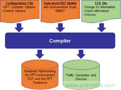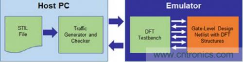 用于硬件加速仿真的 DFT App 改变了硬件加速器在开发阶段的编译流程和运行时间。这将为编译流程和运行时间带来重大变化。具有扫描和 MBIST 结构的门级设计被载入硬件加速仿真的编译器。编译器创建了用于读取Stil文件中测试向量的测试结构,然后将这些向量应用到可综合的待测器件 (DUT) 以及进行输出比较。编译器将用户网表重新编译并合成到一个能够兼容硬件加速仿真的结构化描述中。编译器创建了用于读取Stil文件中测试向量的测试结构,然后将这些测试向量用到可综合的待测设计上,再将网表重新编译并合成到一个能够兼容硬件加速仿真的结构化描述中。测试控制架构还包括比较输出的机制。参见图 1。