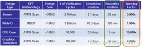 硬件加速仿真的执行速度比软件仿真高出几个数量级,而不是小幅增加。在硬件加速仿真中运行 DFT 模式时,某些衡量标准提高了四到五个数量级。参见表 1。