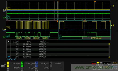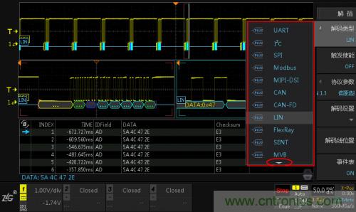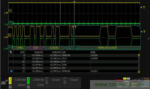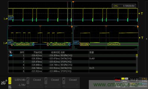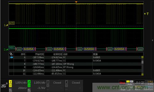 ZDS4000系列示波器免费标配以上30余种协议解码,支持解码以“十进制”,“十六进制”,“字符”三种方式显示,如图9、10所示。