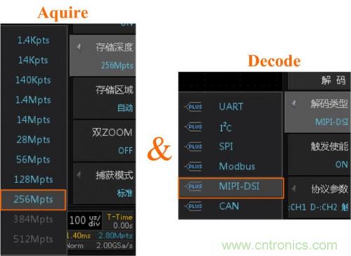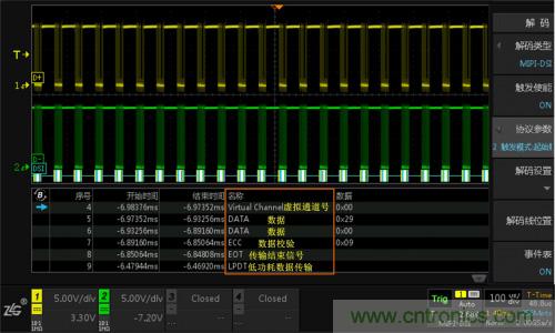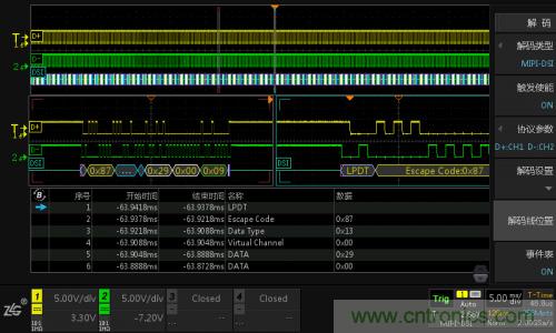 (1)现场模拟MIPI-DSI协议,使用数据挖掘型示波器ZDS4054 Plus,其免费标配MIPI-DSI协议低速LP模式解码功能,具体操作如下图7所示。