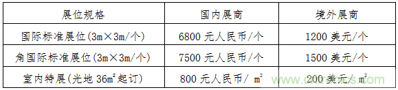 注:A、标准展位提供:三面围板、楣板制作、洽谈桌一张、折椅两把、射灯两只、10A/220V插座一个。B、室内特装展区只提供光地,不提供任何配置,展商自行负责展位搭建布置的各种费用。