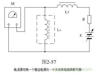这里顺便说明,采用图2-54测试时应该注意的地方。图2-54中,隔离电感LT的大小要求是测试电感Lx数值的3倍以上,并且测量高压包初级线圈的初始电感值L0时,最好也要接入电路之中。这里,隔离电感LT可选取20毫亨以上的带矽钢片铁芯的电感,电感的铁芯要留有一定的气隙;电流源可用一个稳压电源与一个大功率电阻串联代替,如图2-57;或用一个稳压电源与一个大功率晶体放大器串联来代替,如图2-58。
