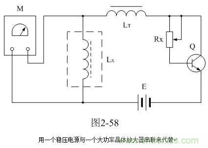在图2-58中,E为稳压电源,Rx为可调电阻,Q为晶体管大功率放大器(必须带散热片);调节稳压电源的电压输出,或改变可变电阻的阻值,就可以改变迭加电流的大小,但晶体管大功率放大器集电极与发射极之间的电压降不要大于10V,否则,晶体管大功率放大器的损耗将很大。一般稳压电源都有电流输出指示,所以在测试电路中不需要另外安装电流表。