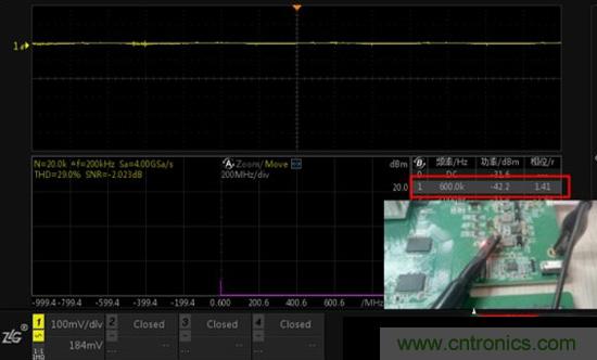 注:通道1信号幅度虽然非常小,但通过FFT分析还是可以定位出600K频点的干扰。