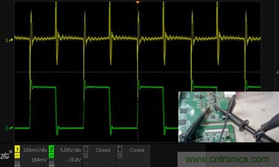 图3.CH1使用夹子测量电源输出,CH2使用夹子测量电感,单点接地