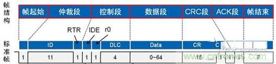 以标准数椐帧为例,从结构上看分成7段,分别为起始段、仲裁段、控制段、数椐段、CRC校验段、ACK应答段、帧结束段,如图1所示: