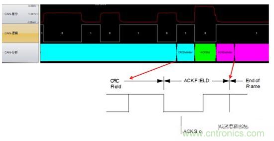 当一个接收节点接收的帧起始到CRC段之间的内容没发生错误时,它将在ACK段发送一个显性电平。 如图3所示: