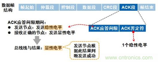应答间隙:所有接收到匹配CRC序列(CRC SEQUENCE)的节点会在应答间隙(ACK SLOT)期间用一“显性”的位写入发送器的“隐性”位来作出回答,由于CAN总线线与的原理,只要总线上有一个节点正确接收到数据,则ACK SLOT就会被填入显性电平。