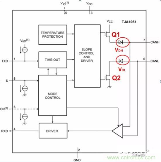 总线显性时(逻辑为0),收发器内部Q1、Q2导通,CANH、CANL之间产生压差;隐性时(逻辑为1),Q1、Q2截止,CANH、CANL处于无源状态,压差为0。