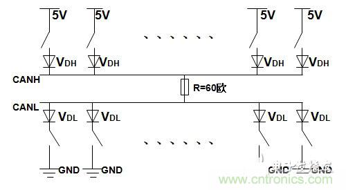 按照标准,在总线输出为显性时,CANH=3.5V,CANL=1.5V,差分分电平:CANH-CANL=2V,总线网络电阻为60欧,流经终端电阻的电流约为33mA(2V/60欧);