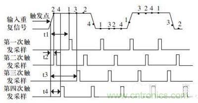 等效采样有可以分为顺序等效采样和随机等效采样。顺序等效采样是在间隔K个周期捕获一个样值,每经过k个周期再经过一个微小的延时△t就获得一个样值。假设k=1时,每周期采样N个点的等效采样和重构过程。最后将采集的数据拼凑到一个周期内,实现对原始输入信号波形的重构。重构后的采样频率变为微小延时△t的倒数。通过控制这个△t的大小,就可以控制等效采样的频率。实际采样频率可以通过控制K的大小进行调节。K越大,实际采样频率越小;而△t越小,等效采样频率越高。这样就实现了低速采样高频信号的目的。