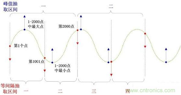 峰值抽取是采样点有 2M,显示点数 2k,实际显示是 2k 个点抽取两个,0~2000 点之间找最大和最小值,然后是 2001~4000 之间找最大和最小值,以此类推,重新构建波形。如下图: