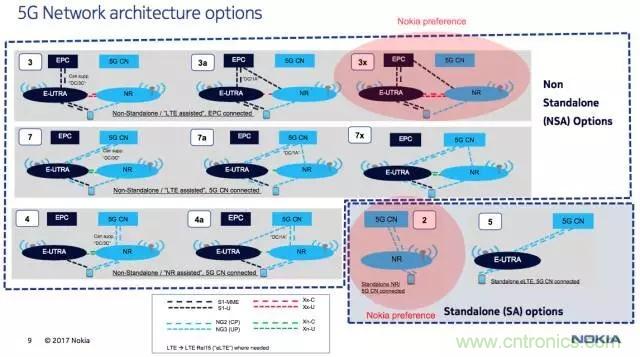 对于5G组网,3GPP在去年釜山会议上由德国电信提出了12种组网选项。其中选项3/3a/3x、7/7a/7x、4/4a为非独立组网构架,选项2、5为独立组网构架。