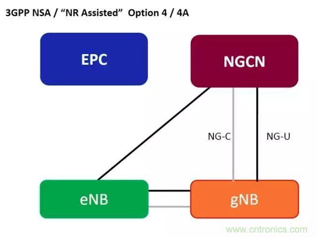 2)4G基站(eNB)和5G基站(gNB)共用5G核心网(NGCN),eNB仍然为主站,gNB为从站,控制面信令走4G基站至5G核心网。