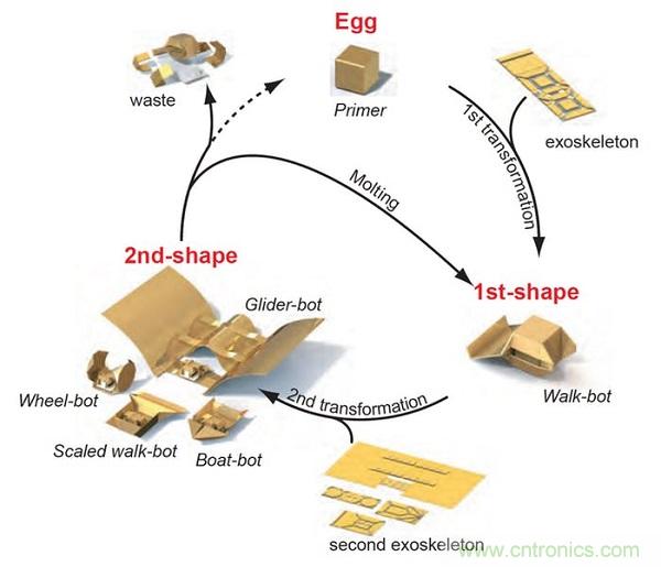 MIT开发透过磁铁远程控制的Primer机器人,其以长方形塑料片制造的外骨骼能自行折叠成不同的形状,为各种不同的任务客制机器人;而当Primer完成工作后,则浸入水中溶解外骨骼…