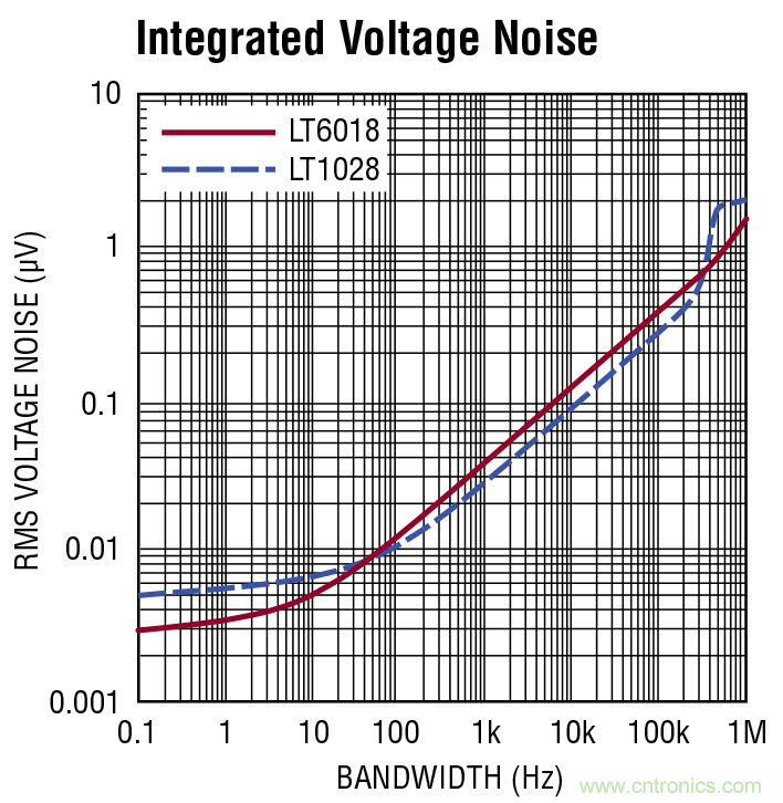 回到 1985 年,ADI的 George Erdi 设计了 LT1028。30 多年过去了,该器件依然是市面上低频条件下电压噪声最低的运放,其在 1kHz 时的输入电压噪声密度为 0.85nV/√Hz,在 0.1Hz 至 10Hz 时的输入电压噪声为 35nVP-P。直到今年,一款新型放大器 LT6018 才对 LT1028 的地位提出了挑战。LT6018 的 0.1Hz 至 10Hz 输入电压噪声为 30nVP-P,并具有一个 1Hz 的 1/f 拐角频率,但是其宽带噪声为 1.2nV/√Hz。结果是,LT6018 是适合较低频率应用的较低噪声选择,而 LT1028 则可为很多宽带应用提供更好的性能,如图 1 所示。