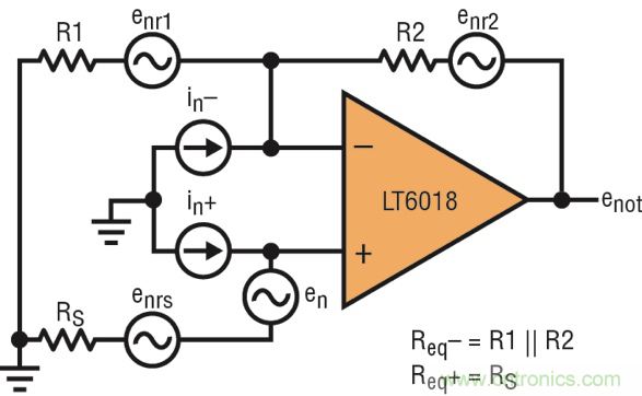 首先,把电阻器看作是噪声源。电阻器天生具有与电阻值的平方根成比例的噪声。在 300K 的温度下,任何电阻器的电压噪声密度为 en = 0.13√R nV/√Hz。该噪声也可被视为一种诺顿 (Norton) 等效电流噪声:in = en/R = 0.13/√R nA/√Hz。因此,电阻器具有一个 17 zeptoWatts 的噪声功率。优良的运放将具有低于该值的噪声功率。例如:LT6018 的噪声功率 (在 1kHz 频率下测量) 约为 1 zeptoWatt。