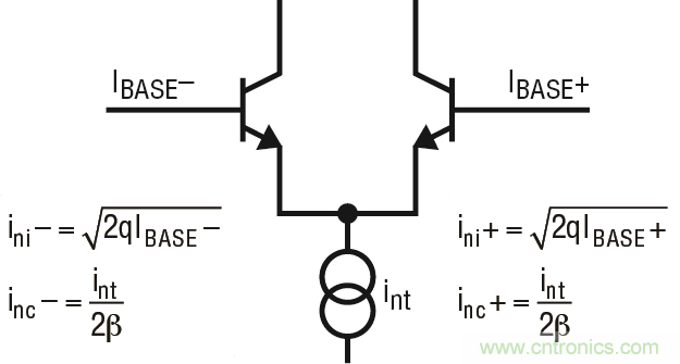 就宽带噪声而论,两个输入晶体管均具有与其基极相关联的点噪声 (ini- 和 ini+),这些点噪声是不相干的。来自位于输入对尾部之电流源的噪声 (int) 还产生了在两个输入之间划分的相干噪声 (在每个输入中为 int/2β)。如果两个输入上承载的电阻相等,则每个输入上的相干电压噪声也是相等的,并且抵消 (根据放大器的共模抑制能力),因而留下的主要是不相干噪声。这在产品手册中被列为平衡电流噪声。如果两个输入上的电阻极大地失配,则相干和不相干噪声分量保留,而且电压噪声以平方根之和相加。这在有些产品手册中列为不平衡噪声电流。
