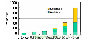 在深亚微米工艺下,电路的功耗主要是跳变功耗,短路功耗和漏电功耗可以忽略不计。但随着工艺发展到纳米级,漏电功耗在整个功耗中的比例将显著提高(如下图所示)。