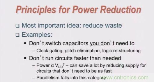 •降低电压:电压受频率影响,可以通过降低频率来降低所需电压。当频率降低,电路开关速度降低,就能有更多时间去进行充电,因此所需充电电压就能降低(电压越大充电速度越快)。同时,可通过流水线分割组合逻辑。若同时保持频率不变,电路能有更多时间去进行充电,从而降低所需充电电压。