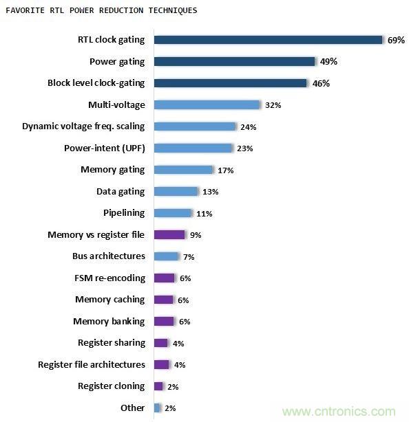除了上述这些方法,高效的低功耗技术还有许多,比如衬底反偏(加反向电压降低衬底漏电),多阈值单元(Multi-Vth cell)等等设计方法。下图是一些比较热门的RTL级低功耗技术。
