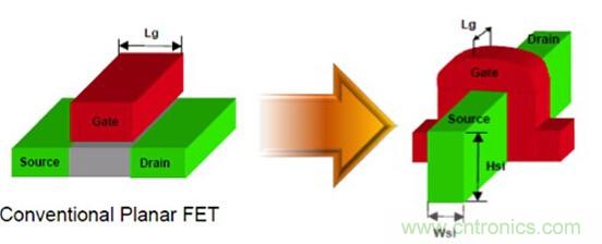 如前面所说,栅极越窄,即纳米数越低,功耗和性能都有明显收益。但是凡事都有两面,有收益就会有代价。上图左图(即前面那张图的结构)中的红色栅极越窄,则栅极接触下面的面积就越小。前面说了,绿色源漏(SD)两极的通断是靠栅极通电压控制的,但是面积越小这个栅极的控制力越弱,这就会导致出现两极之间的漏电越来越大。这个问题在20nm时达到了一个很大的值,对功耗影响很大。所以早在10年前,就有人提出了右图中的3D晶体管的新结构。由于这个结构看上去像张开的鱼鳍,所以被叫做FinFET技术。FinFET技术最主要的好处是红色的栅极变成三面环绕绿色SD两极之间的通道了,这样栅极就又重新具备了对这个通道的强力控制力,原先通过减小栅极宽度的方法就可以继续了。有人可能会有疑问,十年前就提出为什么现在才用,其实概念到实施不是那么容易的。大家脑补一下这个结构是在20nm的范围里做的,导致工艺要多出十几二十层来,这不仅是难度,也是成本。