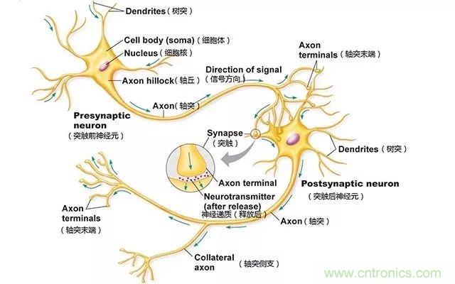 人脑神经元在接受到刺激后,其细胞膜内外带电离子分布将发生变化,因而形成电位差,电位差将沿着神经细胞轴突、树突双向传导,形成脉冲电流。而当该电信号传递到突触时,突触前神经元将释放神经递质(如多巴胺、肾上腺素)由突触后神经元接受神经递质产生兴奋(该过程单向传递),并向下传递作用与人体反应器并发生反应。