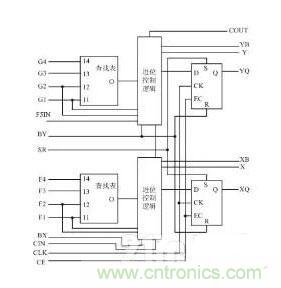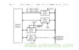 CLB是FPGA内的基本逻辑单元。CLB的实际数量和特性会依器件的不同而不同,但是每个CLB都包含一个可配置开关矩阵,此矩阵由4或6个输入、一些选型电路(多路复用器等)和触发器组成。 开关矩阵是高度灵活的,可以对其进行配置以便处理组合逻辑、移位寄存器或RAM。在Xilinx公司的FPGA器件中,CLB由多个(一般为4个或2个)相同的Slice和附加逻辑构成,如图1-3所示。每个CLB??椴唤隹梢杂糜谑迪肿楹下呒?、时序逻辑,还可以配置为分布式RAM和分布式ROM。