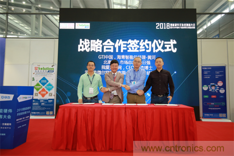 在开启技术方案平台+供应链创新模式的同时,我爱方案网与美国GTI战略合作签约仪式也成功举行,邀请到GTI中国海青智盈总经理黄河先生,北高智市场总监朱仝日强,我爱方案网CEO刘杰博士,深圳市微尔联科技总经理温晓标出席。这也是2017年末AI应用联盟活动的落地,我爱方案网作为GTI芯片方案服务商,携手第一批代理商北高智、方案开发公司微尔联,联合将GTI芯片逐步推向终端市场。