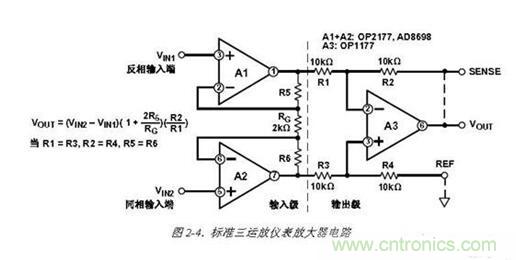 专用的仪表放大器价格通常比较贵,于是我们就想能否用普通的运放组成仪表放大器?答案是肯定的。使用三个普通运放就可以组成一个仪用放大器。电路如下图所示: