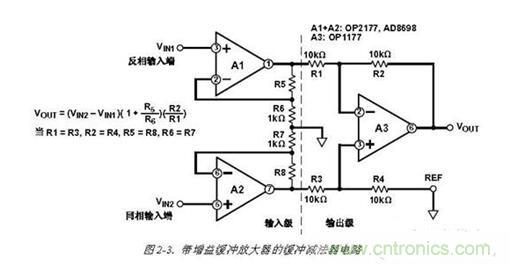 输出电压表达式如上图所示。上图所示的电路增加增益(A1 和 A2)时,它对差分信号增加相同的增益,也对共模信号增加相同的增益。也就是说,上述电路相对于原电路共模抑制比并没有增加。