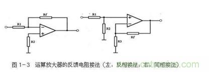 其次,由于放大倍数为无穷大,所以不能将运算放大器直接用来做放大器用,必须要将输出的信号反馈到反相输入端(称为负反?。├唇档退姆糯蟊妒H缤?-3中左图所示,R1的作用就是将输出的信号返回到运算放大器的反相输入端,由于反相输入端与输出的电压是相反的,所以会减小电路的放大倍数,是一个负反馈电路,电阻Rf也叫做负反馈电阻。