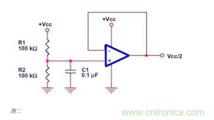 单电源工作的运放需要外部提供一个虚地,通常情况下,这个电压是VCC/2,图二的电路可以用来产生VCC/2的电压,但是他会降低系统的低频特性。
