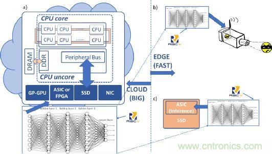在图1a中,云数据中心服务器利用在大型大数据集上训练的深度学习神经网络来执行机器学习的功能。在图1b中,边缘设备中的安全摄像机采用经过大数据训练的推理引擎来实时识别图像(快速数据)。在图1c中,智能固态硬盘设备采用推理引擎进行数据识别和分类,从而有效地利用了此设备的带宽。图1展示了RISC-V内核的潜在机会,它可以自由地添加专有的及未来标准化的矢量指令,这些指令对于处理深度学习和推理技术相当有效。