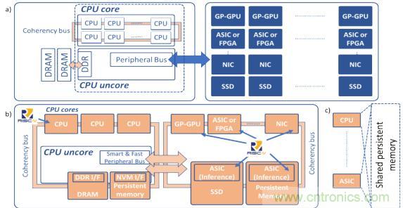 CPU 外围核心及网络接口控制器的作用将成为支持数据移动的关键因素。CPU外围核心组件必须支持密钥内存和永久内存接口(例如NVDIMM-P),也必须支持驻留在CPU附近的内存?;剐枰凳┟嫦蚣扑慵铀倨?、智能网络和远程持久内存的智能快速总线。这种总线上的任何设备(例如CPU、通用或专用计算加速器、网络适配器、存储器或内存)都可以包含其自己的计算资源并具有访问共享内存的能力(图2b和图2c)。