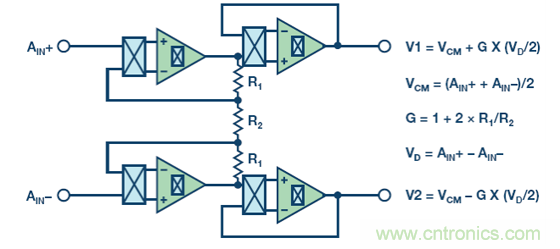 这种容性架构结合了仪表放大器的优势,具有极高的输入阻抗(因为输入阻抗是一个电容),其优势是电容(而不是电阻)作为增益元件,增加了放大器的动态范围——这不仅是因为它的信号摆幅,还因为其噪声效率的缘故。
