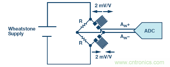 应变计的灵敏度通常为 2 mV/V?;菟沟堑缭丛礁撸槊舳纫簿驮礁?。为了增加应变计的动态范围并最大化 SNR,电桥可能采用比 ADC 更高的电源供电。