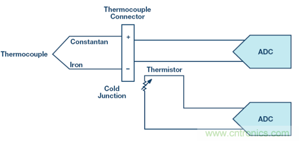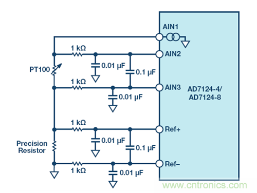 使容性 PGA 性能与阻性 PGA 相当的可行办法是以更高的电源电压对电桥供电。比如,以±3.3 V 双极性电源对电桥供电,从而增加应变计的灵敏度,但代价是更高的系统复杂性和功耗。可能会得益于容性 PGA 的另一个例子是采用电阻式温度检测器(RTD)或热电偶的温度测量应用。常用 RTD 电阻(比如 PT100)可以用来直接检测温度,或间接检测热电偶的冷结,如图 9 所示。