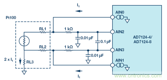 测量温度并消除引线误差的传统方法如图 10 所示。本例中,集成 PGA 的 Σ-Δ 型 ADC AD7124-8 的内部电流源以相同电流驱动双线式 RTD,在两个引线上产生相同的失调误差,其值与引线电阻成正比。