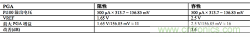 表 2 总结了阻性 PGA 相对于容性 PGA 的最大增益,最大电流源为 500 µA,限制了 Pt100 的自发热(假定 B 类 RTD,此时最高温度为 600°C,最大 VREF 为 2.5 V)。