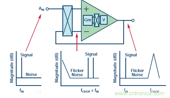输出去斩波机制将输入频率解调回基带,同时向上调制缓冲器产生的失调和闪烁噪声至较高频率,随后由 ADC 低通滤波器加以消除。